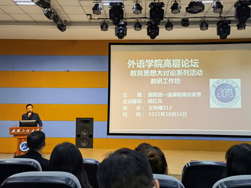 (通讯员:张艳梅)2021年10月14日,武汉工程大学外语学院成功举办国家级一流课程建设实践分享讲座与讨论,该活动系外语学院高层论坛“教育思想大讨论系列活动”—教研工作坊主题讲座。工作坊分专家讲座和针对性指导两部分。