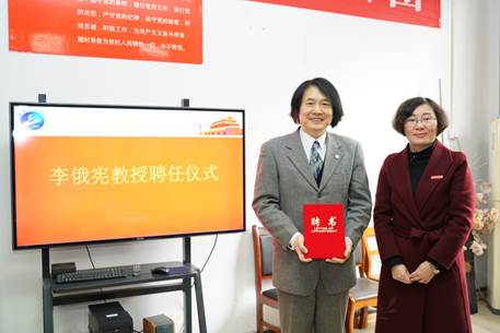 李俄宪教授感谢工程大学外语学院的聘请,表示一定尽最大努力做好工作,为学院外国语言文学学科建设尽绵薄之力。校党委副书记郑丹凤为李俄宪教授颁授聘书并合影留念。