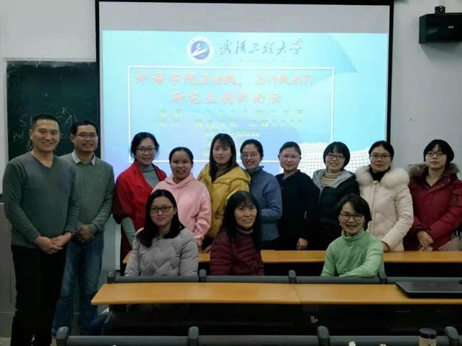 本网讯(通讯员 李曾)12月18日晚7:00到9:00,外语系研究生创新论坛在武昌校区2201室隆重举行。院长陈明芳教授,陈玢、汪桂芬等部分硕士生导师,研究生秘书饶迎涛老师以及18级和19级部分翻译硕士研究生参加了此次学术论坛活动。