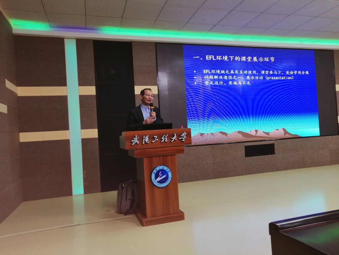 本网讯(通讯员 张云峰)10月17日下午,应武汉工程大学外语学院邀请,南开大学开元(中国)教授、博士生导师,教育部高等学校英语专业教学指导分委员会委员,中国英汉比较研究会英语教学研究分会常务理事,二语习得研究专业委员会常务理事,中国英语教学研究会写作教学与研究专业委员会常务理事张文忠教授,做客外语学院“名师讲坛”,在文科楼315会议室举办了题为“语言课堂‘做学用’展示环节设计”的学术讲座。讲座由外语学院副院长杨建兵主持。