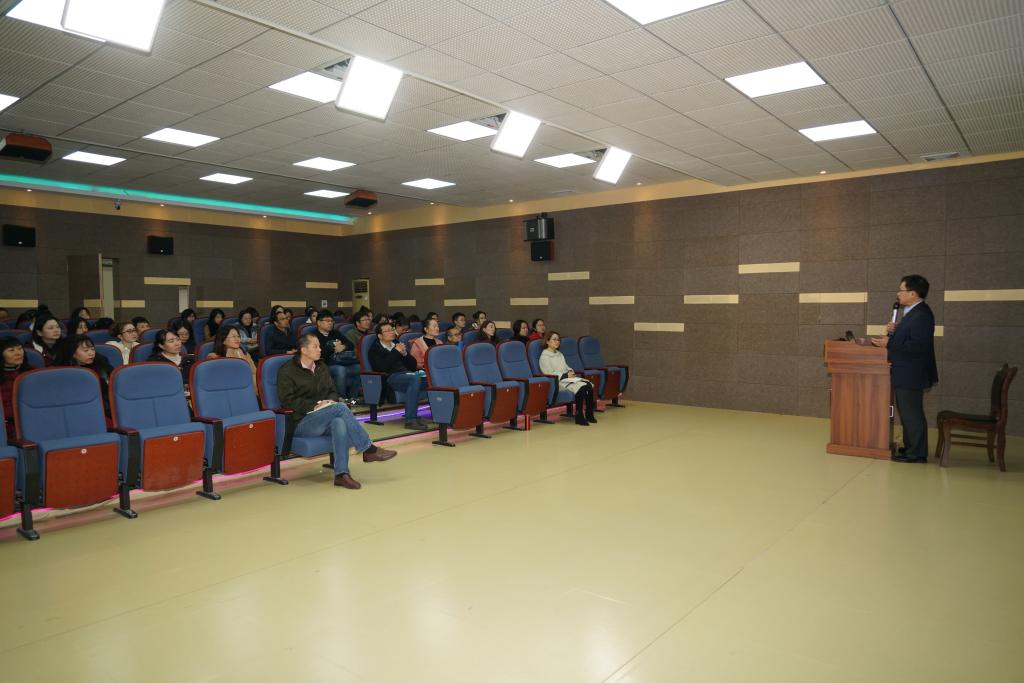 胡开宝教授以“新时期大学外语教师发展:问题与路径”为题,为我院师生详细介绍了极具特色的上海交通大学开元(中国)教师发展模式。让我院师生了解到新时期外语学科发展在人才培养、学术研究、社会服务、文化引领等方面之忧以及新时期大学外语学科教师所面临的资源多样化、中学教学水平高、大学外语地位削弱等多方面的挑战的同时,还指明了教师发展的途径:一是立足教学开展教学研究,尤其是课堂教学研究,如课堂教学话语研究、基于语料库的翻译教学研究等;二是根据研究兴趣和研究能力选择合适的学术研究方向,开展学术研究,如生命伦理、功能语言学、翻译认知等外语学科之文学、语言学、翻译学方向的研究前沿。胡教授还重点介绍了上海交大在政策引领和团队支持等方面对于教师发展的重要贡献。