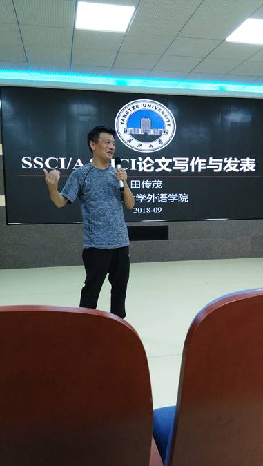 (通讯员 邓军涛 严明)9月2日,应科学技术处和外语学院的邀请,长江大学翻译研究中心主任田传茂教授到我院进行主题为“国家社科基金项目申报有关问题介绍”与“SSCI/A&HCI论文写作与发表”的学术讲座交流活动。讲座由外语学院副院长赵昌汉主持,科学技术处副处长严也舟、外语学院书记陆新、副院长杨建兵、外语学院绝大部分教师等参加了此次学术活动。