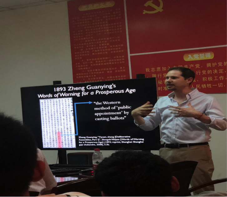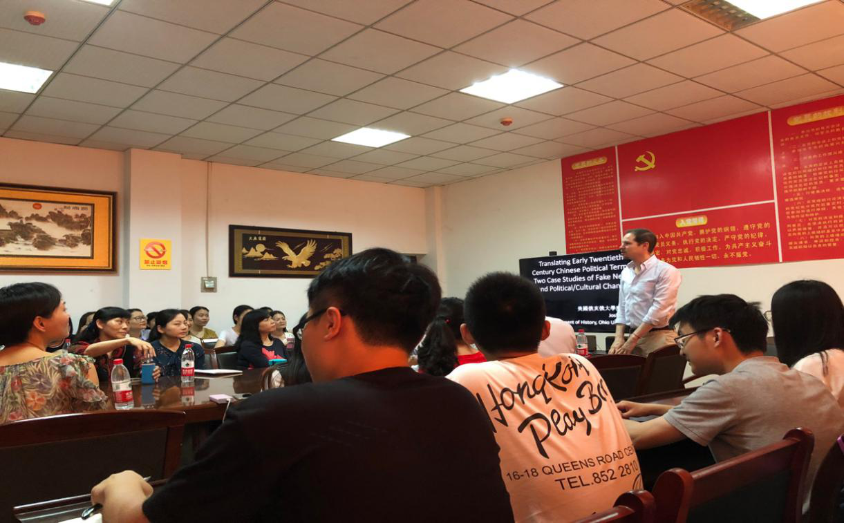 【通讯员李俊良】2018年5月25日下午,美国俄亥俄大学历史系教授 Joshua Hill于外语学院文科楼308会议室为外语学院师生带来了一场名为:“ Translating Early Twentieth Century Chinese Political Terms: Two Case Studies of Fake News and Political/Cultural Change”的学术讲座。