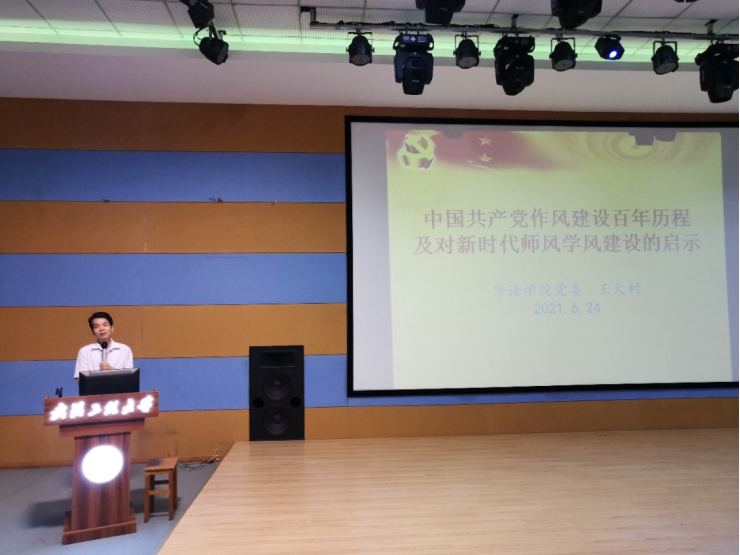 (通讯员 顾泽文)根据外语学院党委党史学习教育实施方案关于系列教育活动安排,6月24日下午,外语学院党委书记王火利在文科楼313报告厅,为学院全体党员讲授题为“中国共产党作风建设百年历程及对新时代师风学风建设的启示”的专题党课。