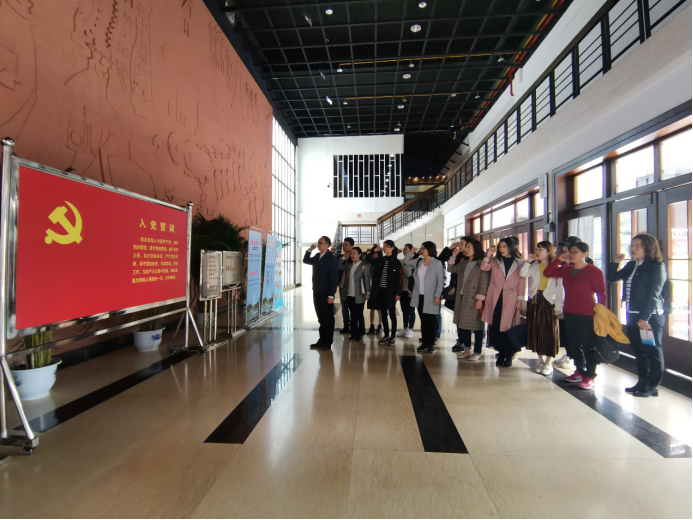 参观结束后,所有党员在纪念馆一楼大厅,高举右拳,由党委书记陆新领誓,共同重温入党誓词。