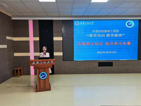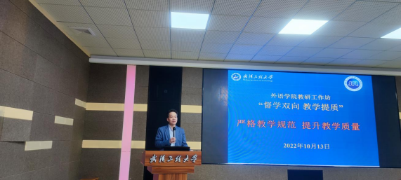(通讯员肖洪波)2022年10月13日下午两点,在文科楼315外语学院举行办教研工作坊“督学双向 教学提质”主题活动。本次活动主题为“严格教学规范、提升教学质量”。外语学院全体教师参加了本次活动。工作坊由教学副院长别尽秋主持。