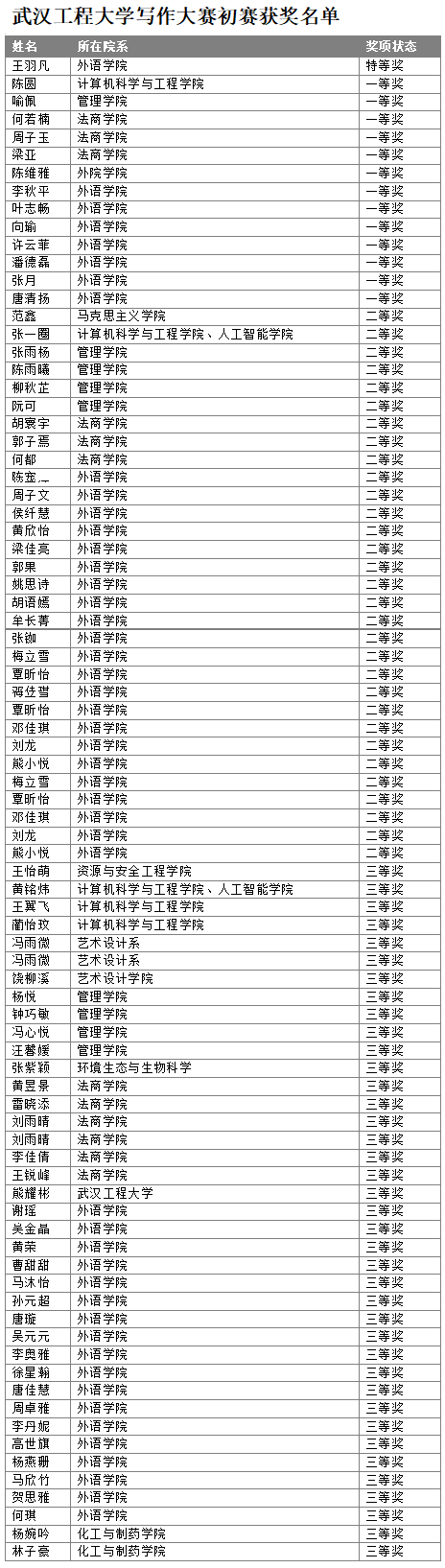 经外语学院老师认真评阅,写作比赛评出特等奖1名,一等奖13名,二等奖26名,三等奖41名,特等奖选手将于11月初代表学校参加湖北省赛区复赛。