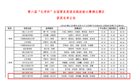 (通讯员张云峰)2022年3月10日至6月24日,2022年“第六届‘亿学杯’全国商务英语实践技能大赛”以云平台测试和主题演讲的形式在线上举行。我校英语专业、英语(辅修营销)专业、会计(辅修营销)专业共40余名同学报名参加了比赛,向欣榕、叶泓舒、李雨曦、唐红霞、张雨杨,左心怡、吴雅欣、查萱怡、张珂凤、徐媛等10位同学顺利通过初赛,组成两支队伍参加复赛,分别获得湖北省团队二等奖和三等奖。此次赛事由全国大学生创新创业实践联盟和中国国际商会商业行业商务英语研究委员会主办,厦门亿学软件有限公司协办。