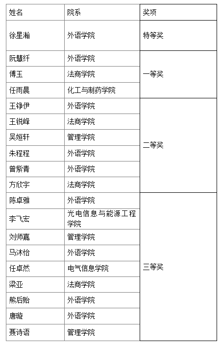校园地面赛(复赛)月9月15日中午在文科楼119举行。在外语学院别尽秋院长的带领下,金海、张云峰、彭能远、徐昕慧和章樊老师参与了现场的评委打分。复赛采用的是与省赛相同的“即兴演讲+问答环节”,旨在测试同学们的思考能力,应变能力,临场表现及分析解决问题的能力。经过激烈角逐,比赛共决出特等奖1名,一等奖3名,二等奖6名及三等奖9名。令人欣喜的是,除了参赛及获奖较多的英语专业选手外,包括化药、电气、材料、环境、计算机、管理学院在内的很多学院都有学生踊跃参赛。在最终出场的41名选手中,英语笔译专业研二的徐星瀚同学脱颖而出,继去年获得校园赛特等奖并获得省赛一等奖之后,再拔头筹,获得今年赛事的特等奖,并代表我们学校,参加将在十一月份举办的湖北省高校英语演讲大赛。