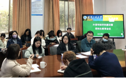 何广惠老师介绍了外国语言文学学位授权点核验工作的基本情况,并重点汇报了校外学科评议组专家反馈的若干问题及后续改进建议。紧接着,邓军涛副院长汇报了翻译硕士专业学位授权点建设与评估中存在的相关问题,并就加强导师队伍建设、凝练研究生培养特色、提升研究生学术成果数量与质量、推荐研究生教研与科研一体化建设等议题进行了重点阐述。