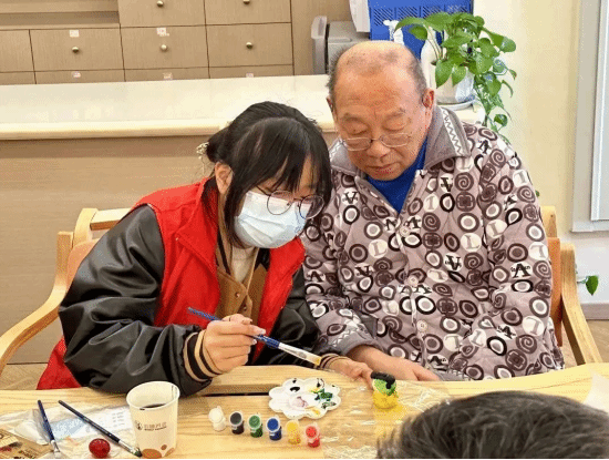 志愿者们和老人们边话家常边给石膏娃娃涂上斑斓的颜色。有的老人手脚不便,志愿者们便耐心地蹲下来扶着他们的手,帮助老人们把石膏娃娃一笔一画涂满。现场一派和乐融融,老人们脸上也洋溢着幸福的笑容。