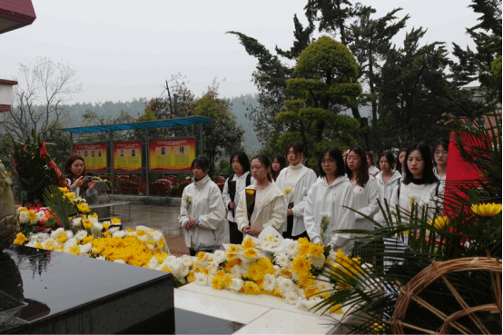 在烈士陵园里,全体师生排列整齐,怀着崇敬的心情,依次向烈士纪念碑敬献花篮;随后,全体师生一起向长眠于此的烈士们肃立默哀。