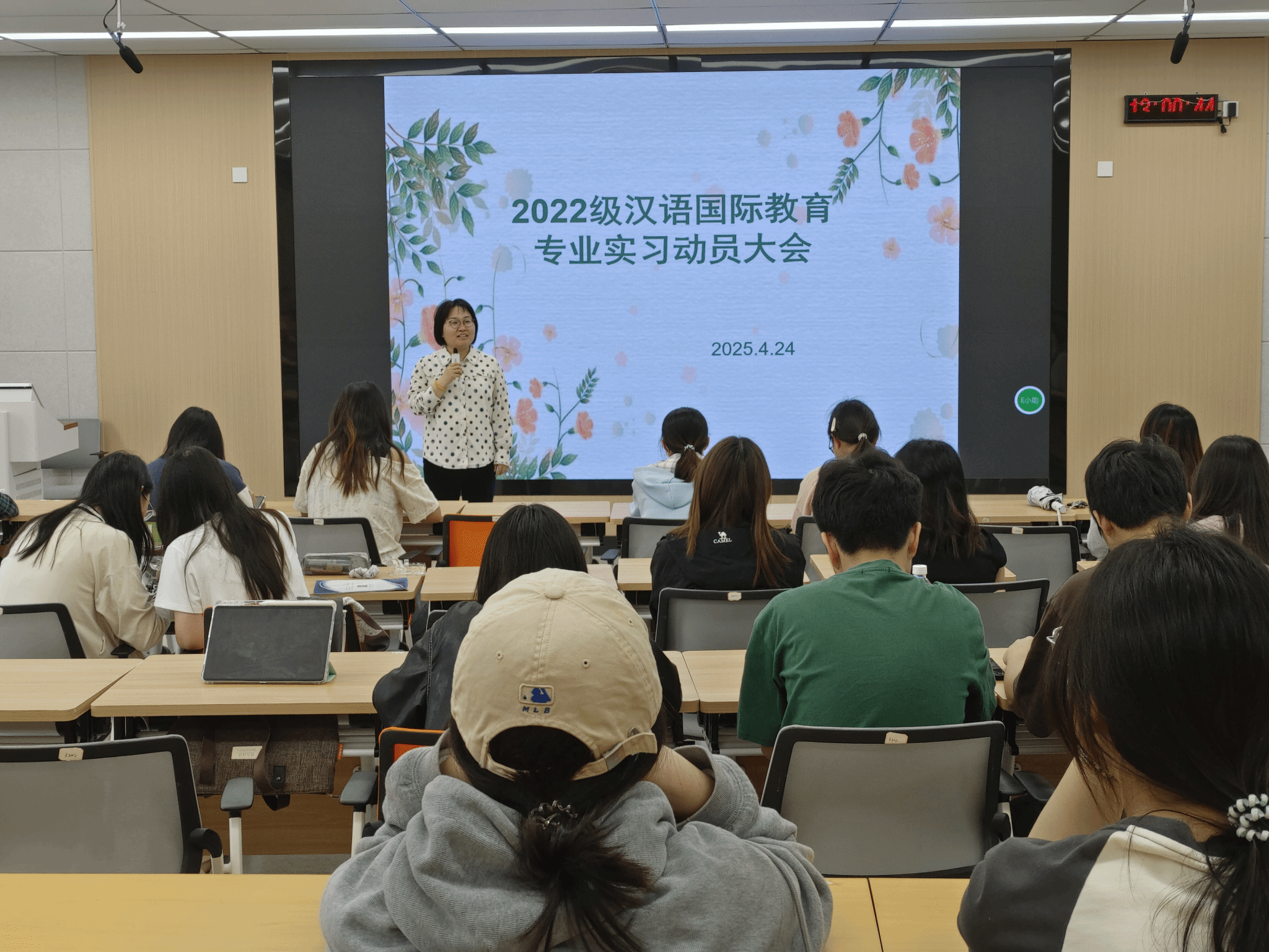 本网讯(通讯员 孟丽)4月24日,外语学院汉语国际教育专业在L3202教室为2022级学生召开专业实习动员会。谢玲玲主任和孟丽副主任就实习安排及相关要求进行详细说明。