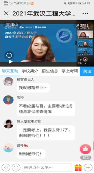 本网讯(通讯员杨建兵)为了让更多的学生了解武汉工程大学和外语学院,吸引优质生源报考我校外国语言文学一级学科硕士和翻译硕士,在研究生院的统一部署下,外语学院于2020年10月10下午15:10-16:10,通过腾讯会议和掌上考研平台,为有意报考我校外语学硕和专硕的考生举办了一场线上宣讲会。参加宣传会的有外语学院院长陈明芳教授、副院长杨建兵教授,以及两个硕士点的宣讲人何广惠教授和凃朝莲教授。