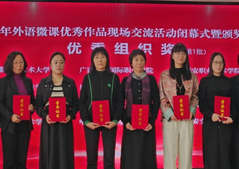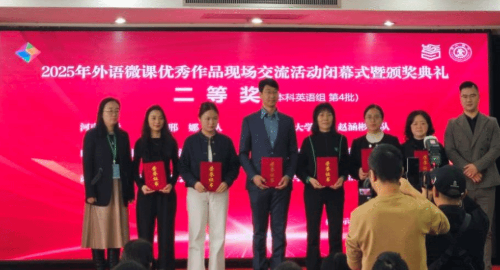 本网讯(通讯员 杨建兵)10月25日,2025年全国外语微课优秀作品全国决赛在西安交通大学隆重举行。我校外语学院陈玢、陈明芳、潘俊、张云峰、侯新婷五位教师组成的教学团队,凭借扎实的教学功底与前沿的数字技术融合能力,荣获本科英语组全国二等奖,外语学院同时荣获优秀组织奖,充分展现了学校在数智化外语教学改革中的创新实力与团队风采。