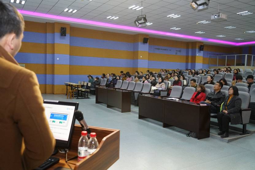 接着,文华在线的张老师向外院领导和全体教师介绍了文华在线数字外院的整体架构、外语混合式教学平台等。刘老师则具体讲解了外语课程开发与应用案例,并演示了外语学院已有的部分网络课程视频。