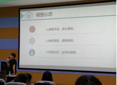 首先翟老师向同学们介绍了辅导员的岗位职责,使同学们对辅导员这一教育岗位有了全面的了解与认识。随后,翟老师通过7组关键词与同学们一起讨论分享了刚刚步入大学的同学应以何种状态投入到新的学习生活中。第一,破立。希望同学们可以打破高中时期对大学的刻板印象,建立起对大学的正确认知。第二,独立。翟老师认为“独立是一种能力,更是一种态度”,希望同学们能够独立肩负起自己的大学生活,在自己的能力范围内独立地去思考与解决问题。第三,尝试。翟老师提到:“大学是一个允许犯错的地方”。只有通过不断地尝试,才能真正地认识自己,发现自己热爱的、向往的、追求的,以及欠缺的。第四,礼貌。翟老师认为礼貌问题是大学生面临的突出问题,更多情况是因为大家的意识不够,希望大家能够在大学当中养成好的社交习惯。第五,理解。大学中过的是一种人人平等的集体生活,