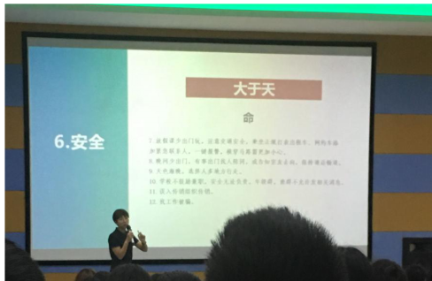 尤其是在寝室生活中,希望大家相互理解,多站在对方的角度去考虑问题,努力将宿舍营造成最为温馨的家园。第六,安全。安全问题是此次年级会的重点内容,翟老师主要围绕人身安全与财产安全两个维度展开,通过各种具体的实例跟同学们分享了身边可能出现的各种安全事件,提醒大家注意交通安全、寝室用电安全、实验室安全等等,并特别提醒大家远离网络贷款。第七,守则。翟老师与同学们重点研读了2019级《学生手册》,尤其对学生管理规定部分做了重点讲解。最后,翟老师告诉同学们,进入大学后要积极调试自己的心态,希望大家能够接受不足,承认差异;要做好规划,道路自信。