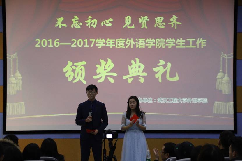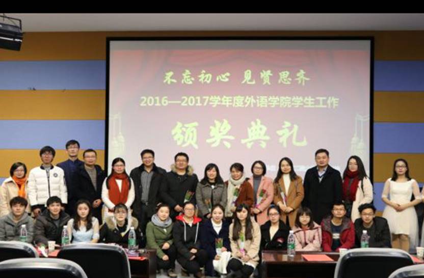 (通讯员:熊元元)2017年12月27日,外语学院2016-2017学年度学生工作颁奖典礼顺利在文科楼313举行。校学生工作处副处长王涛、外语学院领导班子成员、学工办全体教师、班主任代表、“E+”实验区负责人以及2017级全体新生和受表彰学生代表参加了此次表彰大会。