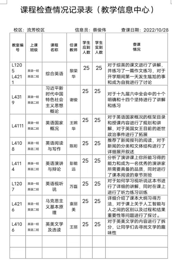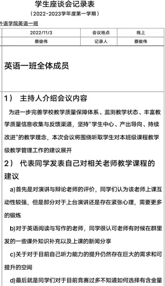图3:21级英语一班学生座谈会、课程检查情况记录表