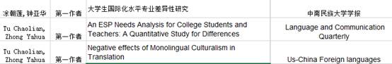学术能力突出,钟亚华同导师凃朝莲教授一起申报项目、撰写论文、组织国际学术会议,整理教学团队考核材料、归纳省级教学团队申报材料。研究生期间共计发表论文三篇,其中论文题目为《大学生国际化水平差异性研究》一文在中南民族大学学报CSSCI源刊录用。