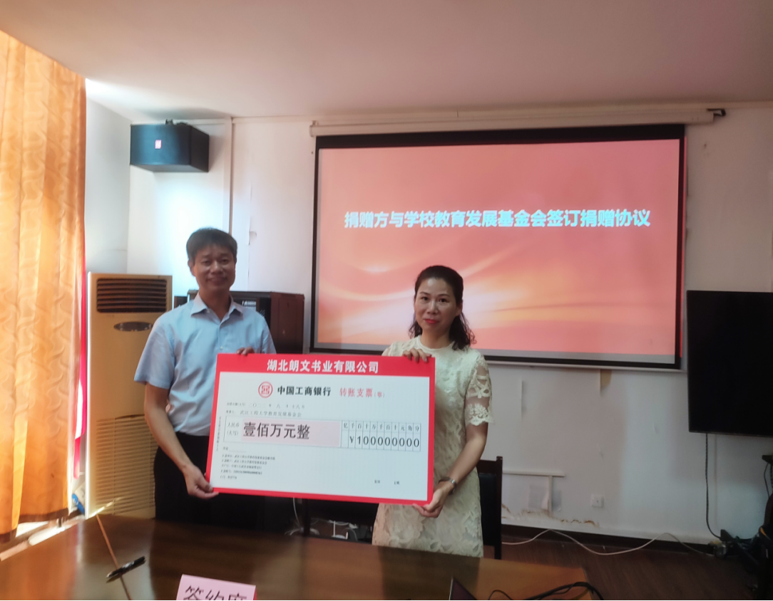 (通讯员杨志、毕灵敏)8月18日上午,湖北朗文书业有限公司向武汉工程大学捐赠100万元,助力外语学院语言教学研究资源和公共课程平台建设,捐赠签约仪式在武昌校区七楼会议室举行。湖北朗文书业有限公司董事长卢汉生,正校级干部、学校教育发展基金会理事长叶芃出席了捐赠签约仪式,参加仪式的还有湖北朗文书业有限公司销售总监吴晶、校友工作与合作发展处、教育发展基金会秘书处、外语学院负责人及相关人员。捐赠签约仪式由校友工作与合作发展处处长邓新洲主持。