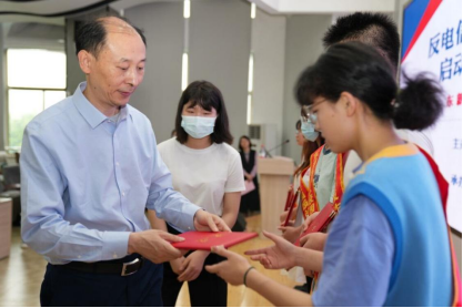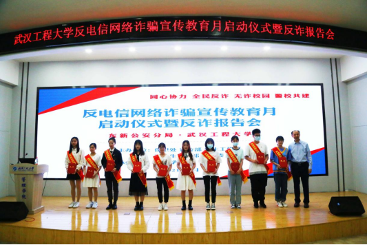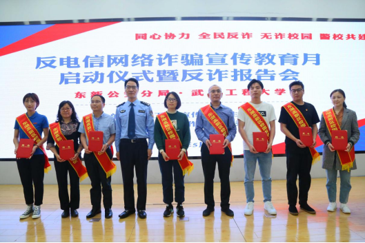 启动仪式上,武汉市公安局东湖新技术开发区分局共聘任我校8名优秀教师代表担任校园反诈大使,33名学生代表担任反诈宣传员。这些反诈大使与宣传员将承担起在校园内向师生进行反电信网诈骗宣传,及时帮助公安机关劝导、阻止潜在受害人上当受骗的义务。