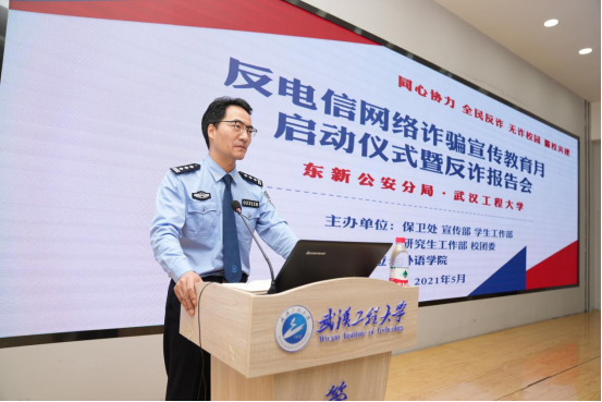 (通讯员徐思思翟莹)为进一步增强我校师生防诈骗安全意识,提高防诈反诈能力,遏制电信网络诈骗案件频发态势,切实保障师生生命财产安全,5月26日,我校联合武汉市公安局东新分局举办了“同心协力、全民反诈、无诈校园、警校共建”反电信网络诈骗宣传教育月启动仪式暨反诈报告会。东新分局党委委员、副局长张磊、反恐(国保)大队教导员谢刚、政治处副主任李雨生,武汉工程大学副校长喻发全、保卫处处长李国林、党委研究生工作部副部长陈俊、校团委书记刘念、党委宣传部副部长万莉莉、外语学院党委书记王火利,各学院党委副书记、学工班主任、辅导员代表及部分师生代表参加会议,党委学工部副部长徐迪迪主持会议。本次活动由保卫处、校党委宣传部、学工部、研工部、校团委联合主办,外语学院承办。