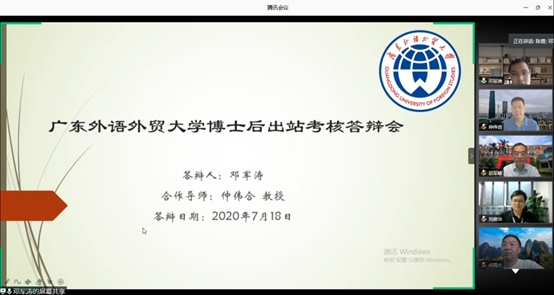 本网讯(通讯员 杨建兵)2020年7月18日上午,广东外语外贸大学翻译学研究中心在腾讯会议举行云端博士后出站答辩会。武汉工程大学外语学院的邓军涛博士参加了此次答辩,对他在站期间的科研与工作情况做了题为“数字化口译教学语料库创建与应用研究”的总结汇报。