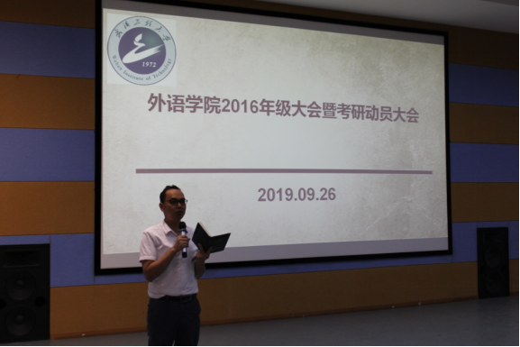 (通讯员任鹏)为充分调动2016级学生考研积极性,帮助学生了解考研形式及政策,从而正确选择,填报理想的学校,学院于9月26日下午14:00在文科楼313报告厅召开了2016级考研动员大会暨年级大会,学院党委书记陆新、院长陈明芳、教研室和系主任代表王伟、班主任代表杜朝明以及全体2016级本科生参加了此次会议。会议由辅导员任鹏主持。