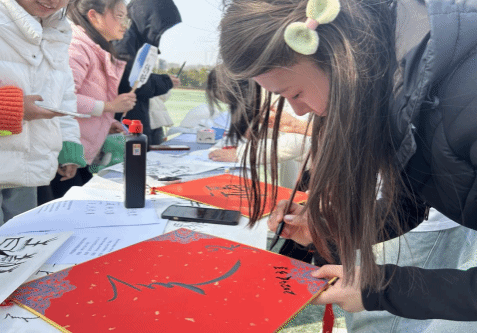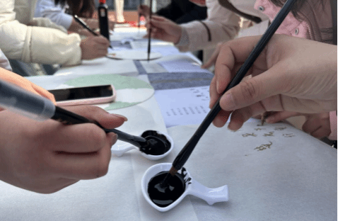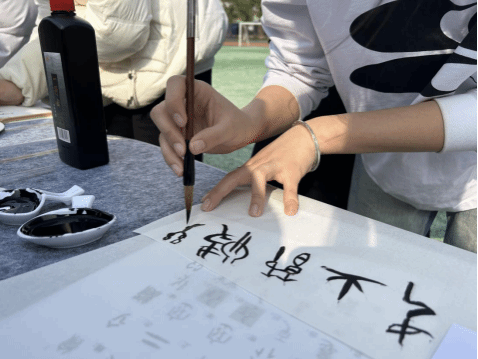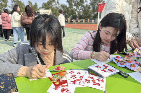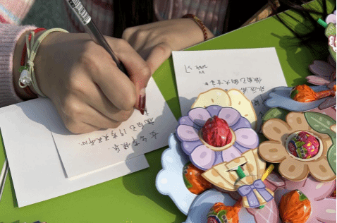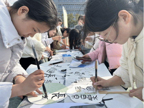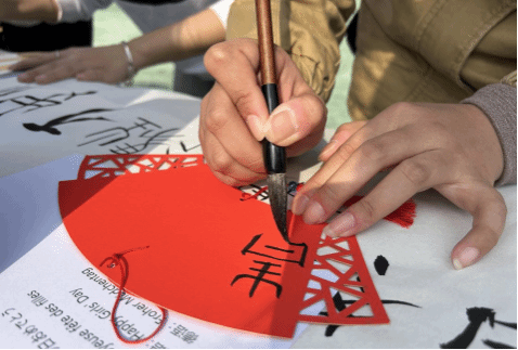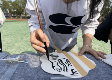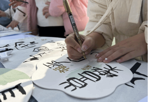 英语专业和汉语国际教育专业的同学们用甲骨文、英语、日语等语言书写各式各样的女生节祝福。在扇子和挂件上一撇一捺的勾勒,加上精心的排版设计,女生们创作出一幅幅独具特色的文创作品。
