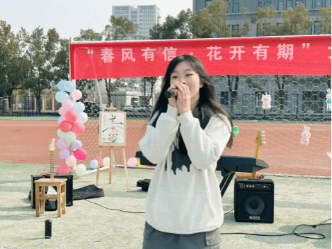 “走在风中,今日阳光,突然好温柔...”咖啡因乐队演唱的《温柔》和《茶底世界》让现场气氛瞬间升温,在旋律中唱出了属于女生们的温柔。周婕同学的《忽然之间》和熊梓威同学的《小美满》将春天拌得越来越甜,女生们脸上洋溢着甜蜜的微笑,跟随节拍摇动着手中的气球,沉浸在这美好的氛围里。