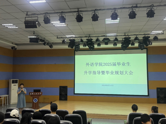 (通讯员 周贝)为精准对接我院2025届毕业生的发展需求,提升学生考研、就业的积极性和主动性, 9月12日下午,外语学院在文科楼313报告厅召开了2025届毕业生升学指导暨毕业规划大会。主讲嘉宾为本科生院副院长别尽秋,学院党委副书记丁春毅、2025届毕业生辅导员周贝和年级近200名学生参加了此次活动。