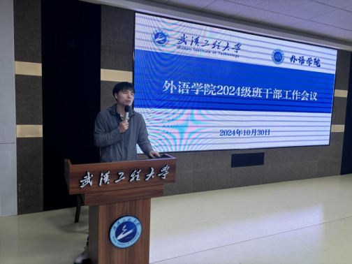 (通讯员 陈顺 安娜 舒苑)为扎实推动年级本科教育教学审核评估工作,进一步加强班风学风建设,提高班干部工作效能,10月30日下午,外语学院在文科楼315报告厅召开2024级班干部工作会议。2024级各班班委、学习小组负责人、寝室长参加会议。会议由辅导员陈顺主讲。
