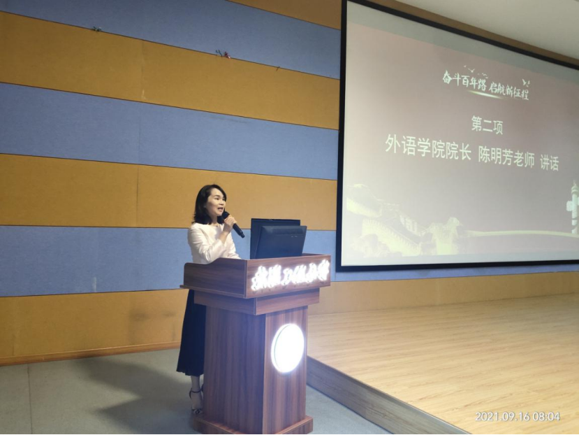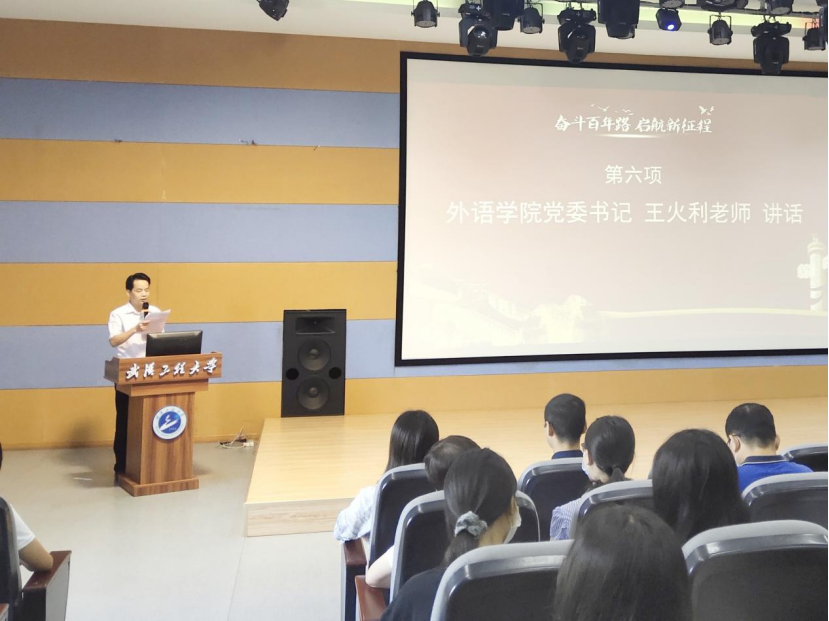 外语学院党委书记王火利老师结合党史知识,在讲话中表达了对新生的三点建议:第一,坚定理想信念,树立远大理想;第二,学好专业知识,练就过硬本领;第三,坚持全面发展,提升综合素质。最后提出希望同学们珍惜韶华、刻苦学习、奋力拼搏,努力成为担当民族复兴大任的栋梁之才。