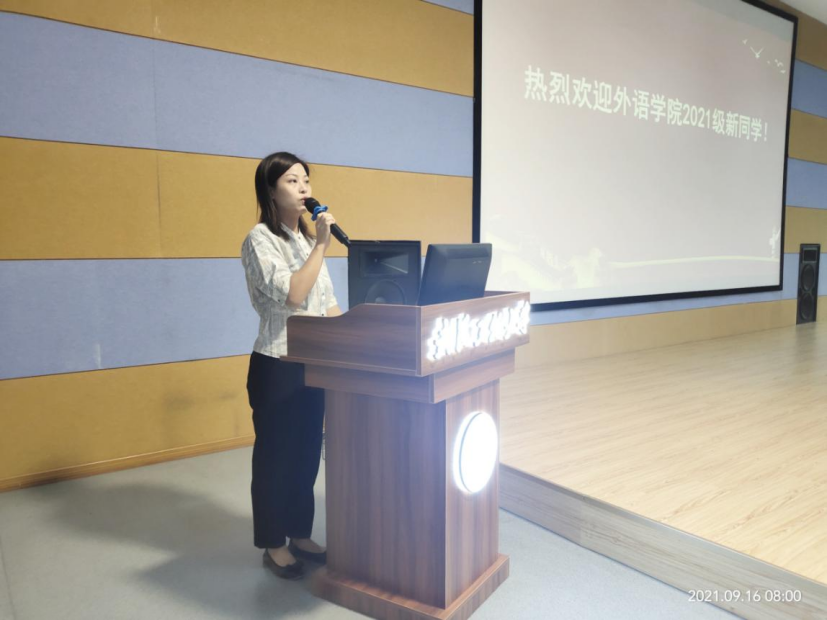 9月16日上午,外语学院在文科楼313报告厅举行了2021级新生开学典礼暨安全教育讲座,外语学院党委书记王火利、院长陈明芳、党委副书记徐思思、副院长别尽秋、院长助理邓军涛等领导、教研室主任、院办和教学办老师、年级辅导员、新生班主任及2021级全体新生参加了此次活动。开学典礼由院党委副书记徐思思主持。