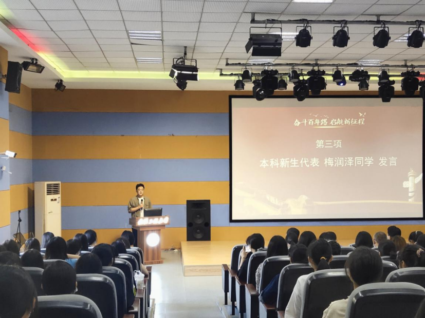 本科新生代表梅润泽在发言中提到了自己刚到外语学院时的感动和期待,希望大家在关于未来四年学习和生活中的四点要求上一起努力、不断学习,今后能用自己的所学专业向世界讲述并且讲好中国故事。