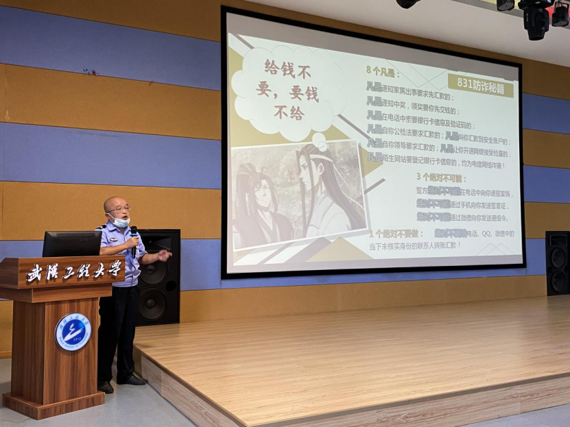 开学典礼结束后,保卫处欧阳诗虎老师和余华兵老师为外语学院全体2021级新生开展了安全教育讲座。欧阳诗虎老师普及了消防安全知识,用真实案例提醒新生要注意寝室用电安全问题以及消防器材的使用。余华兵老师在防诈骗讲座中对我校流芳校区以往上当受骗的案例进行了数据分析,同时也揭露了几例最常见的骗局,提醒学生要钱不给,给钱不要,不要和骗子进行过多的交流。