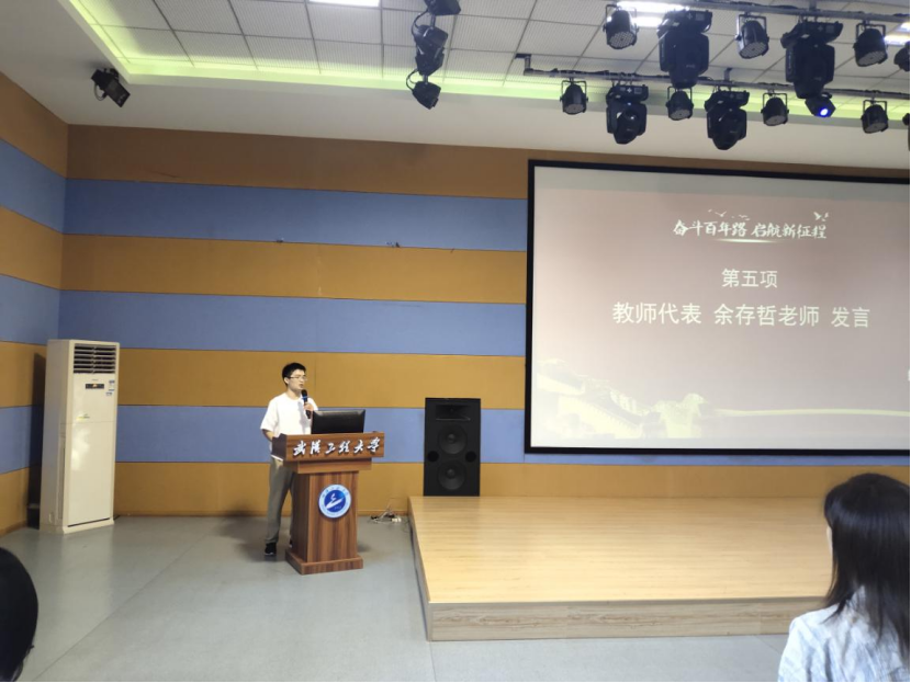 随后是教师代表余存哲老师发言。他从亲身经历出发,向新生分享和从不同角度解释他的“抬头看路、埋头做事”的座右铭,希望新生都能有金色的大学生活。