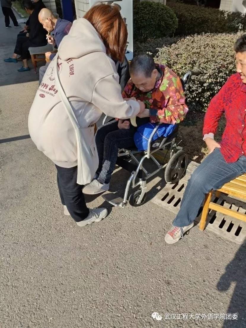一行的志愿者,相继和一些精神状态比较好的老人交谈聊天,推他们去晒太阳。一方面了解他们在这里的生活,另一方面,给予他们一些陪伴和温暖,很多老人在这里都很孤独,没有子女或者常年不来看望,所以,在这样的契机下,我们可以缓解老人们的孤独感,让他们感受到仿佛儿女在侧的幸福。