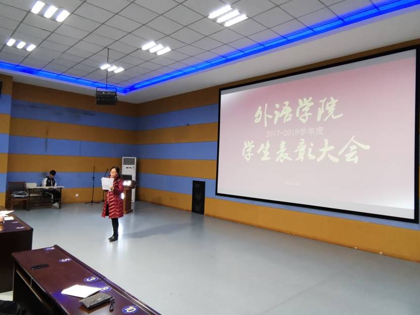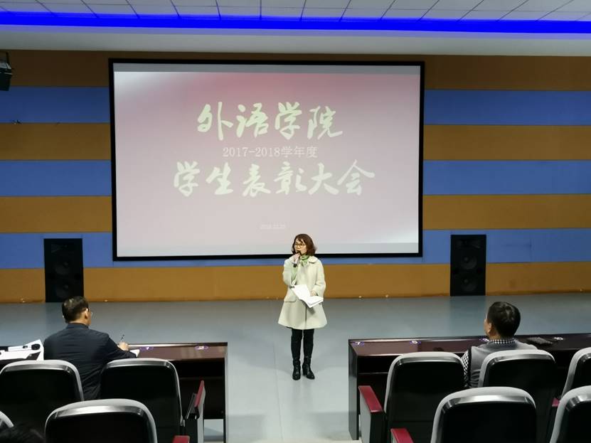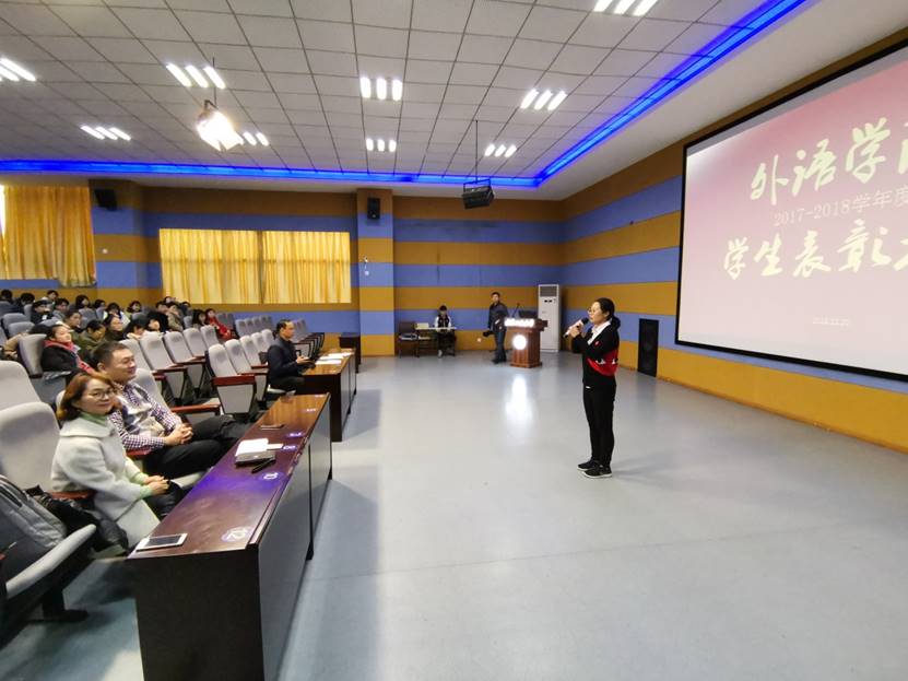 会议表彰了国家奖学金(研究生)、优秀研究生,由外语学院院长陈明芳宣读名单并为他们颁奖。