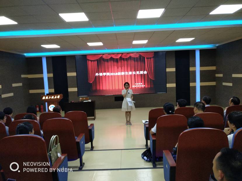 陈明芳首先代表学院向新生及家长的到来表示热烈的欢迎,欢迎大家来到美丽的江城武汉生活,来到武汉工程大学求学。接下来陈院长结合外语学院教学实践对外院的教学研究机构以及各专业情况进行了介绍,使得新生家长对各专业情况有了进一步了解并对外语学院的育人水平有了信心。