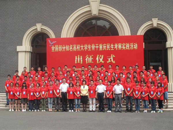 7月14日,80名来自北京大学、清华大学、武汉工程大学等全国名校大学生骨干齐聚山城,砺兵秣马,参加全国部分知名高校大学生骨干重庆民生考察实践活动。本次活动由团重庆市委、市学联、中国青年报社、重庆广播电视集团(总台)、中国高校传媒联盟主办。中共中央政治局委员、重庆市委书记薄熙来做出了重要指示。市委副书记张轩向考察团成员授旗,市委副秘书长罗庆宏、团市委书记王志杰、副书记卢波等领导出席并举行启动仪式。16日,重庆市市长黄奇帆为考察团成员做了近3个小时的专场形势报告会。