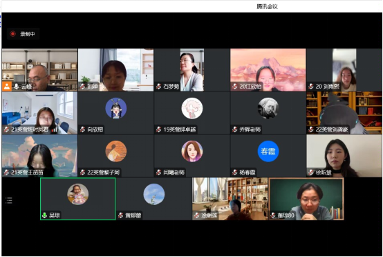 21级同学对英语方面课程提出建议,如希望商务英语阅读课程能学习更多商务内容,综合英语习题讲可以改为线上检查以增加课堂精度内容,英语阅读与写作课程希望增加一些互动环节等,闫曦老师和徐昕慧老师对同学们的问题做出解答,表示会增加互动,并会和课程组的老师们交流好的方法;张云峰老鼓励学生平时也要主动找老师沟通,交流。