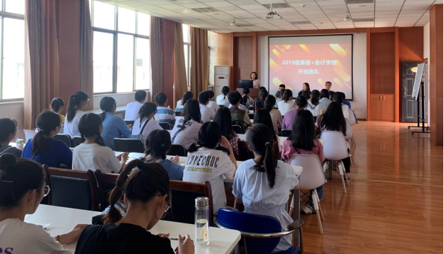 本网讯(通讯员王玮瑾)9月20日,2019级“英语+会计学”双专业班开班典礼在文科楼505举行。管理学院会计系主任许慧、副主任蒋瑜峰、“英语+会计学”双专业外语学院负责人王婉华、管理学院2019级辅导员王海澎出席典礼。