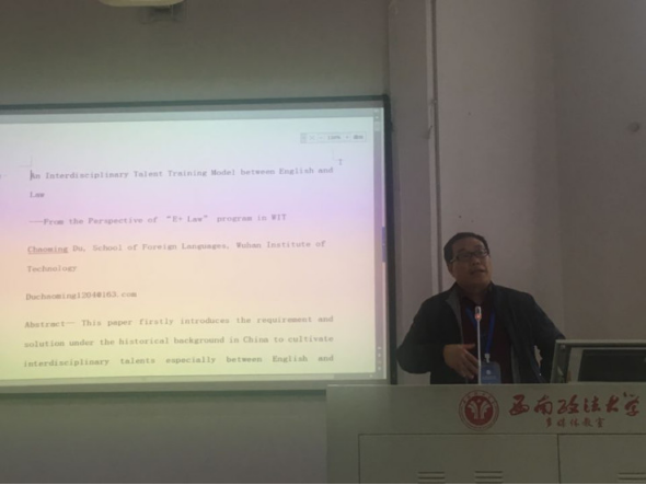 外语学院“英语+法学”专业负责人杜朝明副教授应邀参加会议并以“AnInterdisciplinary Talent Training Model for English and Law”为题做了英文发言。杜朝明老师首先向参加会议的代表系统介绍了我校“E+”项目的发展历史、运行模式、目前状况以及面临的挑战和问题。接着,他以“E+法学”专业为例,用“橘生淮南则为橘,生于淮北则为枳”为喻,说明由于法律体系、法律制度、法律规定的不同,同样的法律概念、法律行为、法律理论甚至同样的司法案例在以不同语言为载体的法律环境中(英文和中文),人们的理解、表达、应用和处理也会迥然不同。在此背景下,就如何确定法律英语的教学内容、教学方法、教学实践及测试等问题,同参与会议的代表进行了深入的交流。