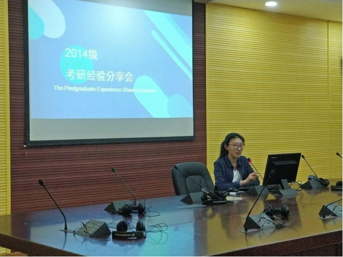(通讯员陈芷娟)2018年5月2日星期三下午,2014级“E+”学生考研心得分享会在文科楼117举办。本次活动由杨志老师主持,并且邀请到了许多本次考研取得优异成绩的同学来分享考研心得。 有来自“E+材料化学”专业刘文同学(中南大学)、“E+化工”专业的的丁辉和程曦萌同学(华南理工大学),以及史晋星同学(南开大学)和肖瑶同学(西北农林科技大学),来自“E+软件工程”专业的罗会珍同学(华中科技大学),来自“E+市场营销”专业的金柳同学(北京外国语大学)。