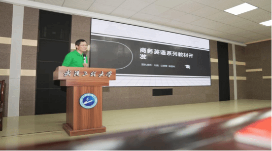 刘煜老师团队的项目是《商务英语系列教程编写》,其目的是满足我校“E+”人才培养模式的学生需求和全国外语类人才培养的新要求。他从商务英语读写教程编写内容、资料来源、编写团队和教学内容等方面进行了细致的汇报。