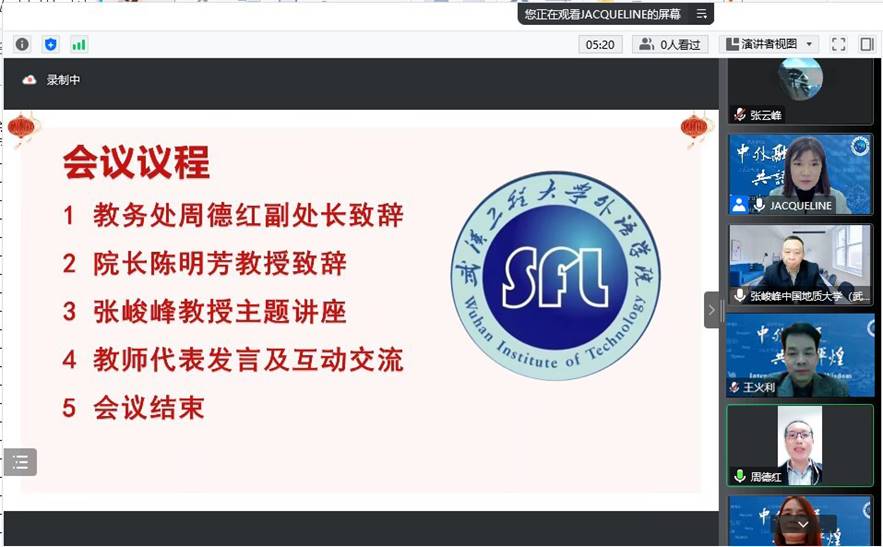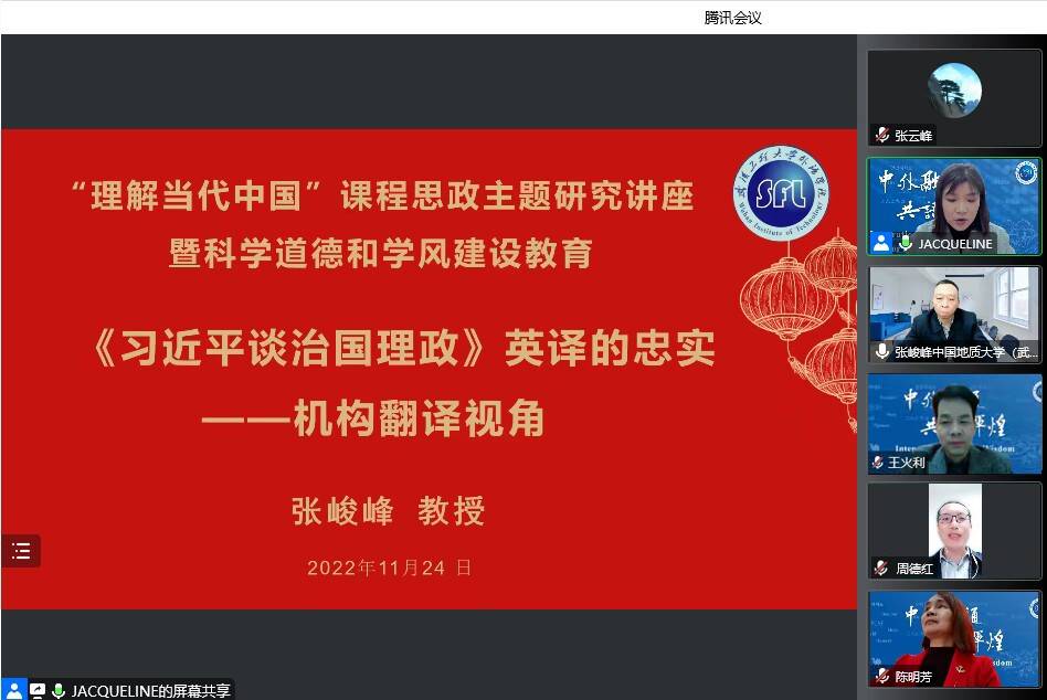 (通讯员:别尽秋、余果)为庆祝武汉工程大学建校五十周年,外语学院与校庆办、教务处、研究生院联合举办高端学术讲座。本次讲座于2022年11月24日下午在线上举行。主讲嘉宾为中国地质大学(武汉)开元(中国)院长、博士生导师张峻峰教授,讲座题目为“《习近平谈治国理政》英译的忠实——机构翻译视角”。会议由外语学院副院长别尽秋主持,教务处副处长周德红,外语学院领导班子全体成员、学院教师及研究生共计160余人参加了本次讲座。本次讲座为外语学院教研工作坊“理解当代中国”课程思政主题研究讲座暨研究生科学道德和学风建设教育系列活动。