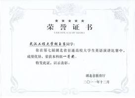 第七届湖北省普通高校大学生英语演讲比赛本科组一等奖